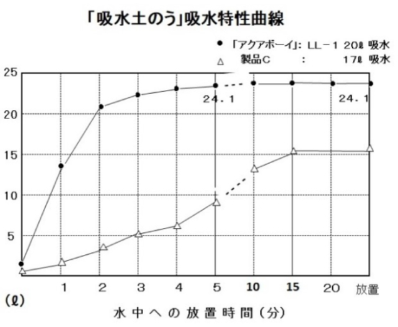 表示吸水量は17 / 20ℓと、3ℓの違いはあるが「アクアボーイ」は2分で表示吸水量に達するのに対し製品Cは20%程にしか達していない。