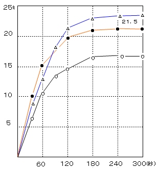 | 考察: | ○: | 資料ーTは始めから茶色の汚れていた。又、吸水曲線は資料ーTに比べると極端に下がっていたのでこの10年間の間に梱包から出されていたものと推測する |