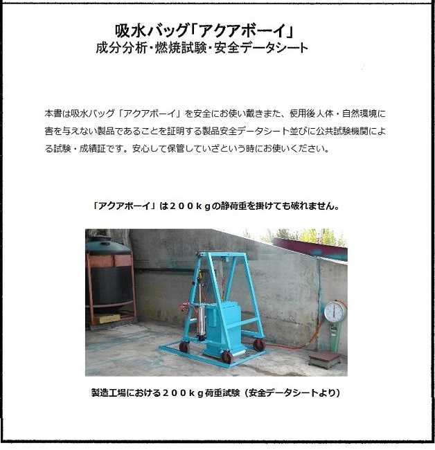 「アクアボーイ」はその性能特性が認められて地方自治体・公共事業体などでも採用されるようになり、公共性のある製品となってまいりました。従って人体・環境への無害性を証明する必要があることから、当社は公共試験機関に依頼し下記試験成績を完備、皆様に公開しております。必要なお客様にはお送りしておりますのでご一報ください。